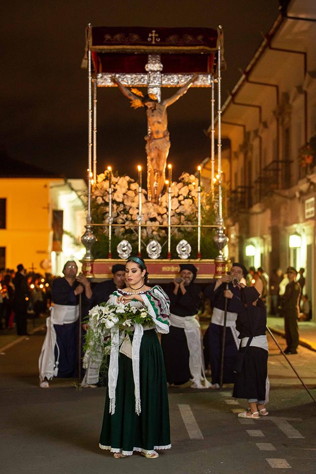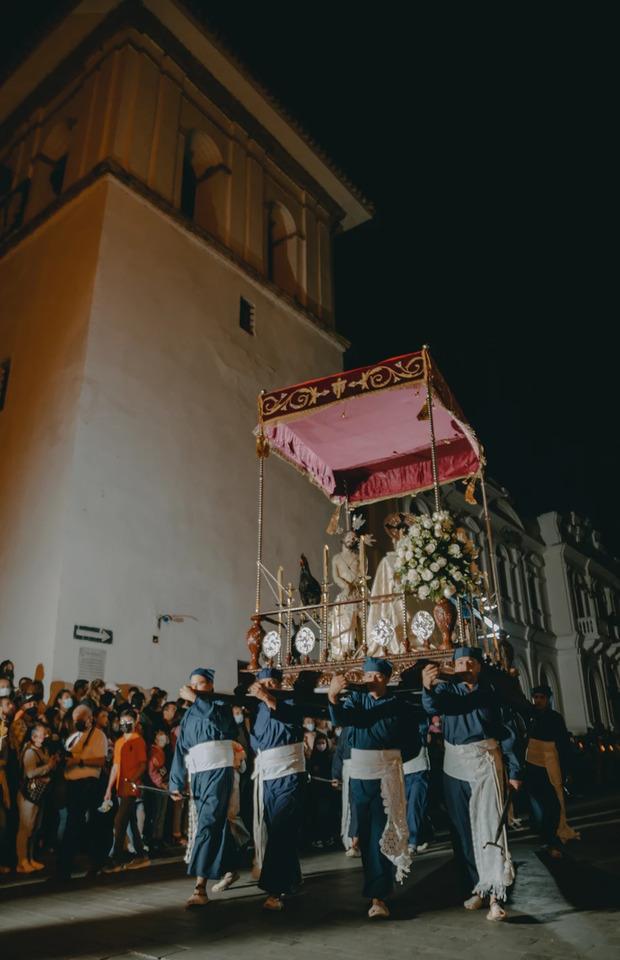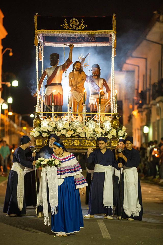 En esta primera noche se puede ver sobre las calles del centro de la ciudad, el desfile de los pasos adornados con flores blancas, simbolizando la pureza de Jesucristo; como también, se le venera en este acto religioso a la Virgen de los Dolores.